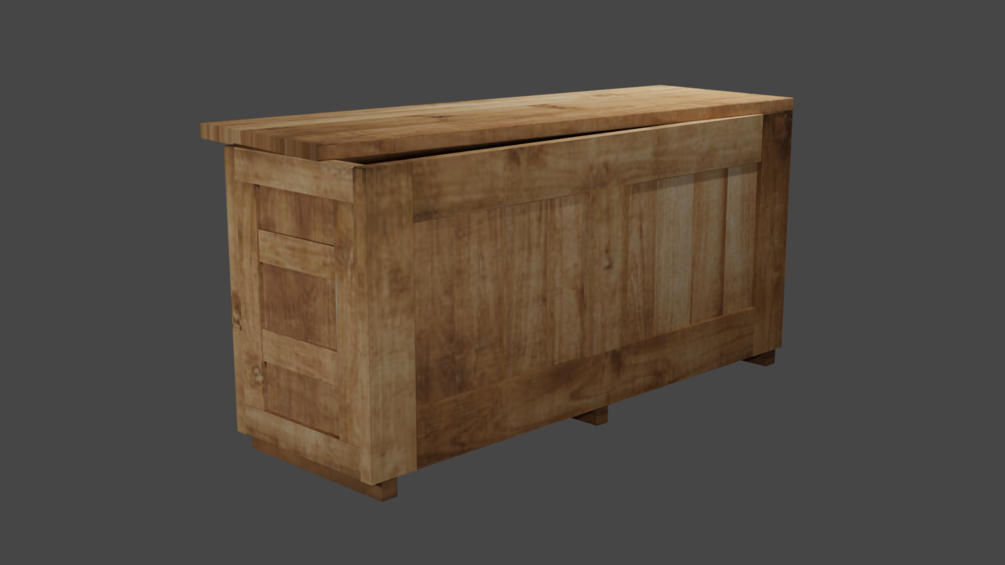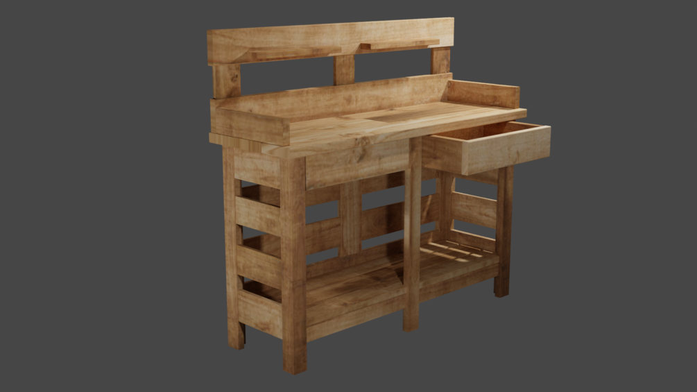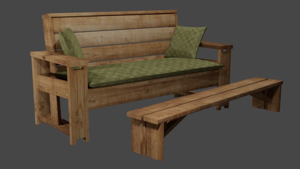 one chest, one workbench, one picnic table and one sofa with leg-bench.